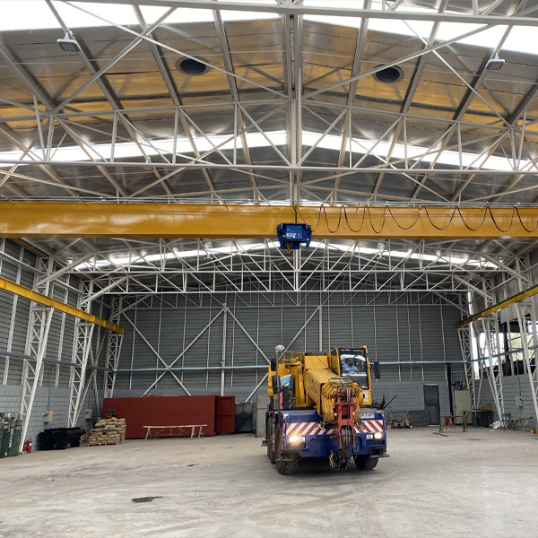 Fabricación y montaje de estructura reticulada 3.000 m² de naves industriales. Se incluye cálculo, fabricación y montaje de puente grúa de 22 m de luz y capacidad de 5 ton. Estructura se entregó con aplicación de pintura intumescente.
